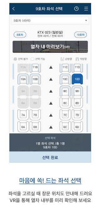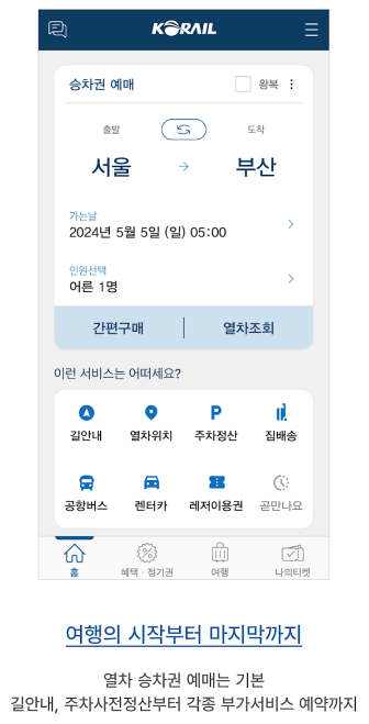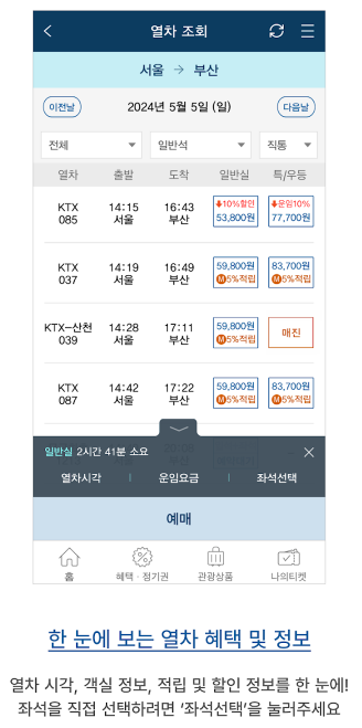 - 열차 종류(KTX, ITX 등) 및 좌석 등급 선택
