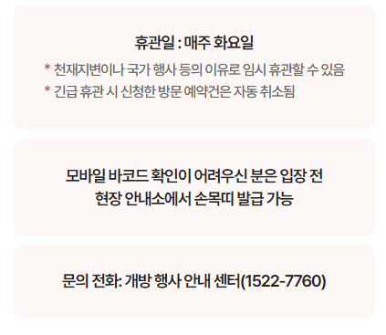 - 사전 예약은 여전히 필수이며, 매주 화요일 오전 10시, 익주 관람 일정을 선착순 접수합니다.