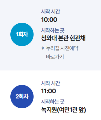 - 청와대 관람신청은 매주 화요일 오전 10시부터 선착순 접수